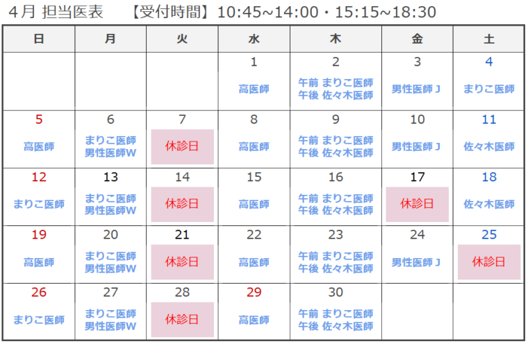 高医師:4月29日(水)・5月6日(水)祝日、診察(10時45分₋14時、15時15分₋18時30分)を行ないます